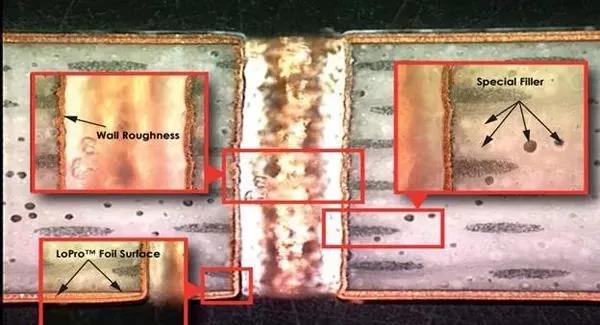由于微球的存在,電路加工結(jié)構(gòu)的外觀——例如從一個(gè)導(dǎo)電層到另一個(gè)導(dǎo)電層的金屬化過(guò)孔(PTH)——看起來(lái)比沒(méi)有采用這種特殊介質(zhì)填料的傳統(tǒng)的線路板材料,制作形成的金屬化過(guò)孔要更加粗糙??赡芸雌饋?lái)是這樣的,又或者是有什么其他的擔(dān)憂,畢竟因?yàn)椴捎弥锌瘴⑶蛱盍系木€路板在做金屬化過(guò)孔時(shí)孔壁非常的粗糙。但一系列的研究表明,無(wú)論是在射頻頻率下,還是對(duì)5G無(wú)線網(wǎng)絡(luò)的毫米波頻率下,中空微球填料對(duì)金屬化過(guò)孔的影響純粹是表面外觀上的,它并不會(huì)影響電路的性能或金屬化過(guò)孔的可靠性。
