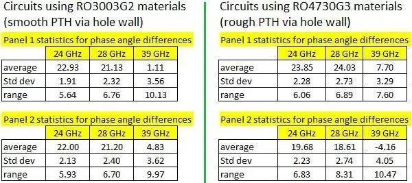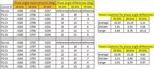 圖5中的電路ID可以顯示電路來(lái)自哪個(gè)12×18英寸的大板,以及該板上的電路ID編號(hào)。例如,P1 C4來(lái)自板1,電路編號(hào)為4號(hào)。電路彼此之間互相遠(yuǎn)離并均勻地分別在12×18英寸的板上,以保持一致性。某些變化是可以事先預(yù)料到的,因?yàn)樗鼈儗?duì)相位角的差異非常敏感。某些變化是由于PCB制造過(guò)程而造成的,而不是金屬化過(guò)孔壁粗糙度的原因,包括導(dǎo)體寬度的變化,鍍銅厚度的變化和鉆孔質(zhì)量的變化。此外,金屬化過(guò)孔周圍的縫隙由于PCB的正常制造公差也會(huì)出現(xiàn)一些變化。同樣,每個(gè)板上的微小材料變化,如Dk值的微小變化,也可能導(dǎo)致相位的變化??紤]到圖5所示的測(cè)試值,在39 GHz時(shí)相位數(shù)據(jù)的可重復(fù)性標(biāo)準(zhǔn)差小于±1.2度,這是非常好的。