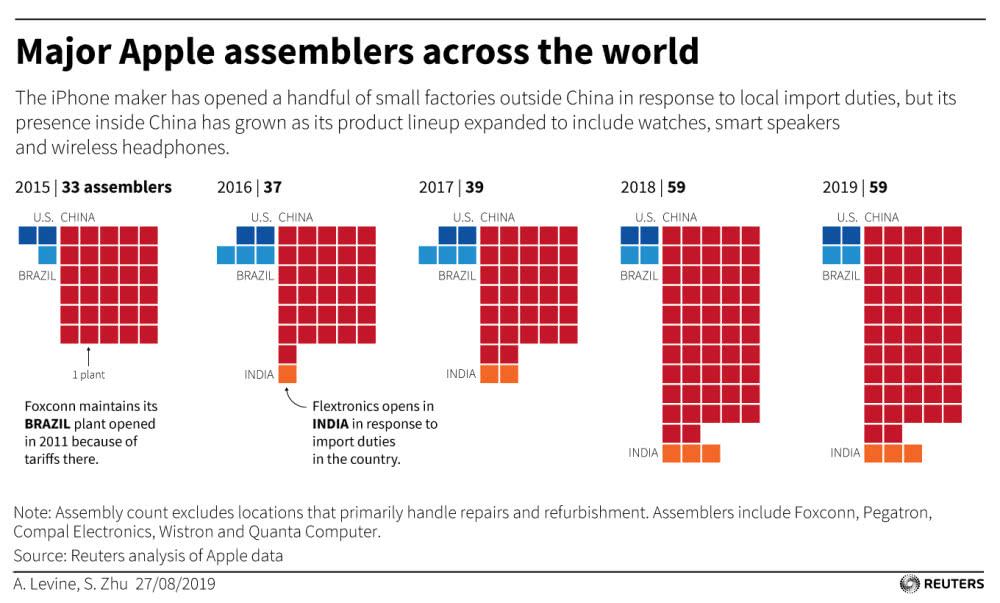 但是在這里產(chǎn)出的蘋果數(shù)量相比全球?qū)μO果的需求而言,只是杯水車薪。路透社 2019 年 8 月經(jīng)過調(diào)查后發(fā)布的報告顯示,蘋果在印度和巴西兩國生產(chǎn)的產(chǎn)品只是用來滿足當(dāng)?shù)匦枨?,而在中國增加的蘋果代工廠遠超過中國以外。